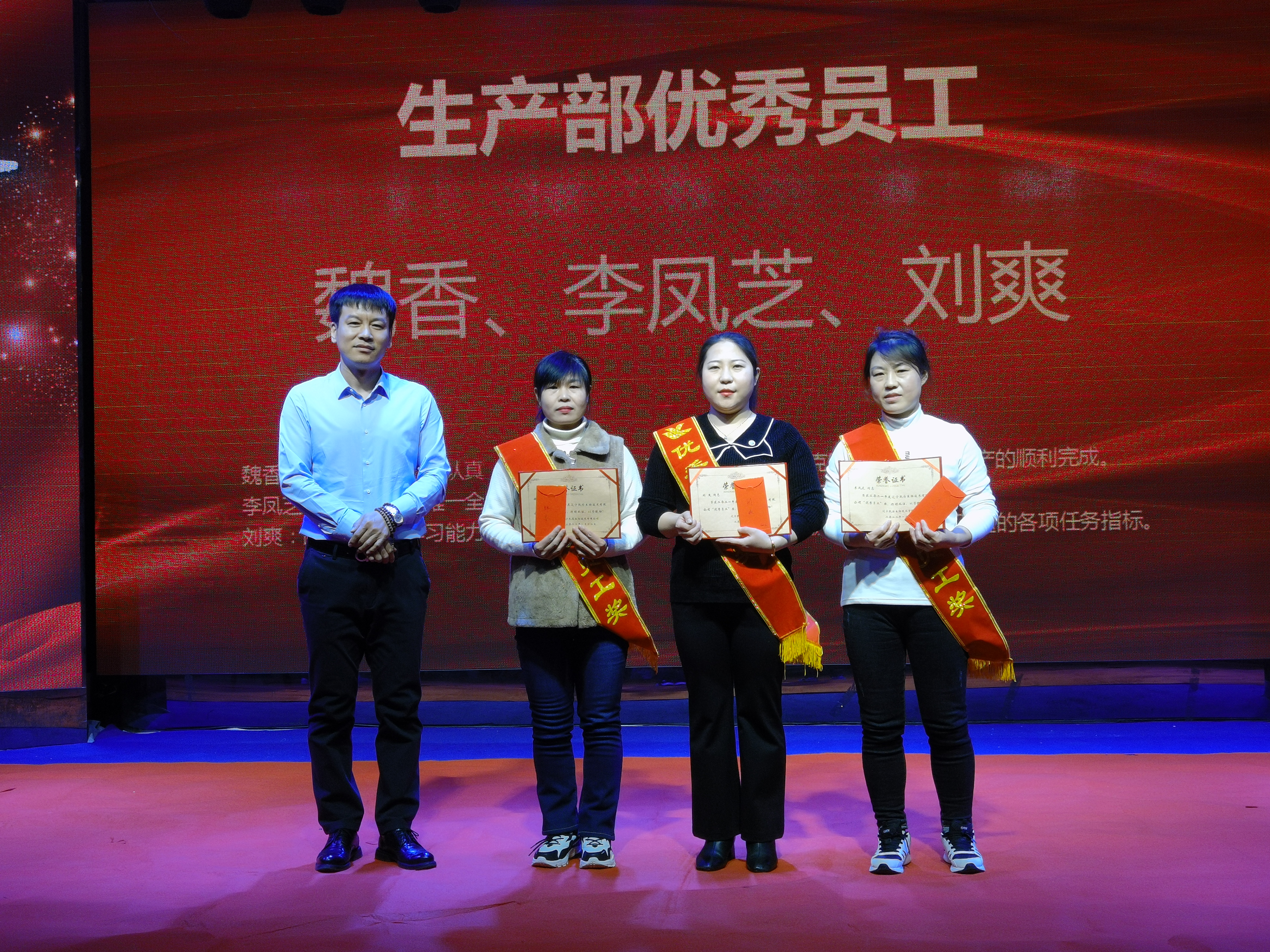 魏香、李鳳芝、劉爽獲得生產(chǎn)部優(yōu)秀員工獎,他們生活在生產(chǎn)一線,在生產(chǎn)車間改造情況下,能夠吃苦耐勞,克服困難,積積主動,盡職盡責的工作作風滲透到車間的每一個日子,每一個角落,他們勤勤懇懇,他們熱情洋溢,他們默默無聞地創(chuàng)造著自己的價值。公司網(wǎng)絡(luò)事業(yè)部總經(jīng)理趙福寬為獲獎?wù)?/span>頒獎。