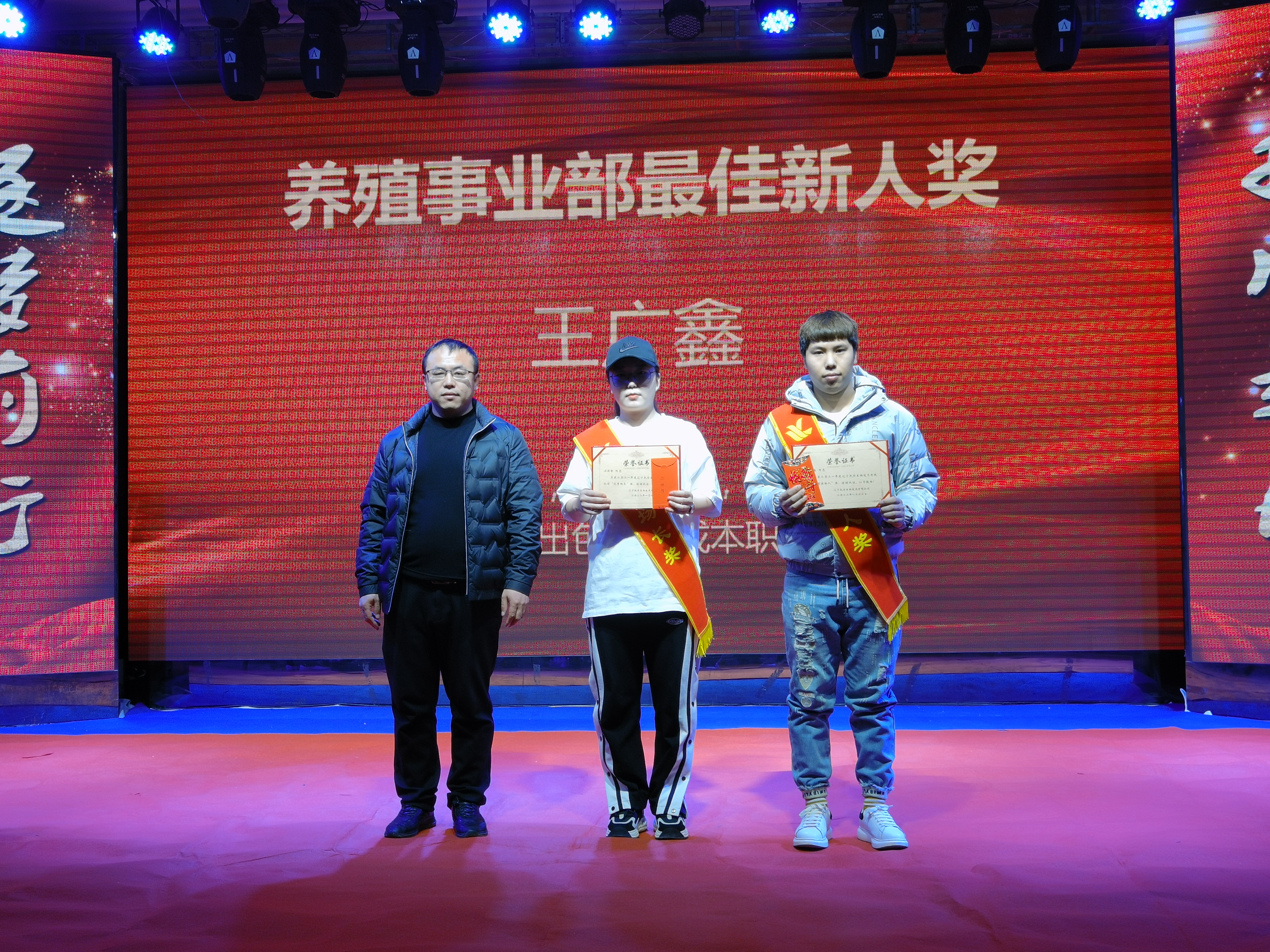 叢林智、王廣鑫獲得2021年度優(yōu)秀場長、最佳新人獎。叢林智工作積極努力,技術(shù)精湛。能吃苦,肯鉆研,使凱豐養(yǎng)殖小區(qū)的出欄成績大幅度提升。并且創(chuàng)造凱豐養(yǎng)殖小區(qū)歷史最高歐值410以上,利潤單只最高。王廣鑫踏實肯干,勤奮好學(xué)。協(xié)助場長出色的完成本職工作。得到領(lǐng)導(dǎo)和同事的一致的高度好評。公司養(yǎng)殖場總經(jīng)理劉迪為獲獎?wù)?/span>頒獎。
